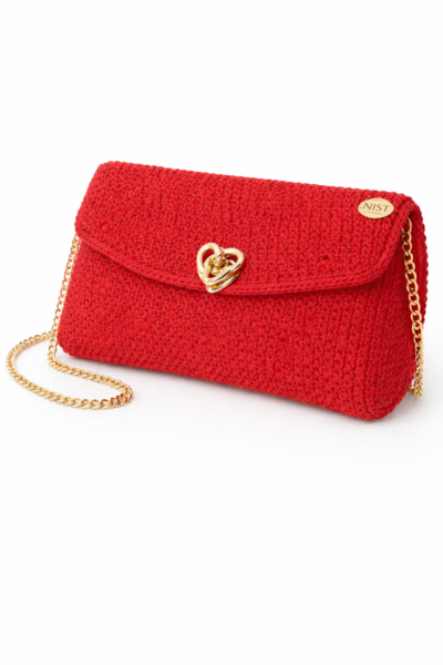 Das fein gearbeitete Häkelmuster verleiht der Tasche eine elegante Struktur und eine hochwertige, spürbare Textur. Der goldfarbene Kettenriemen harmoniert perfekt mit dem warmen Rotton und wird durch den herzförmigen Verschluss stilvoll ergänzt – ein liebevolles Detail, das Romantik und Eleganz vereint.